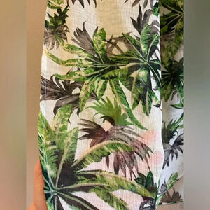 Excellent pre owned condition with no flaws. Long sheer palm tree patterned maxi skirt with very high side openings, over a white mini skirt. Bottom of the maxi is a rounded. Side zip. Would be cute over a swimsuit or with sandals and a t-shirt!