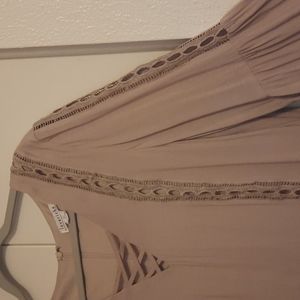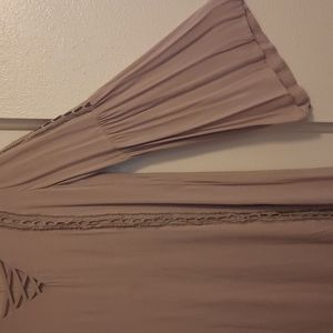 Love Riche Tunic with Crisscross V Neck, Long Bell Sleeves. Beautiful Crochet Detailing running down front of Tunic. Crochet Detailing running down half way on Sleeve. Size Large. Color Taupe. Measurements Length 33"approx. Armpit to Armpit 20" approx. Length of Bell Sleeves 25" approx. This Tunic is truly Unique & Beautiful. Excellent Condition. Please see pics.