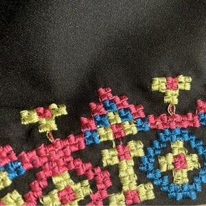 Love Riche sheath size Medium. Pink, blue green embroidered neckline and arm. Fully lined. 17” pit to pit 15” waist 21 “ hip Shoulder to hem 33” Flat measurements # 19 p m d
