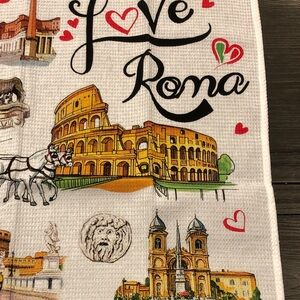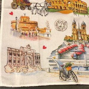 Decorative tea towel featuring colorful Rome landmarks and heart accents. Soft white fabric with vivid yellow, green, pink and tan illustrations. Bright graphic design adds a cheerful touch to kitchen or gift displays. Machine-washable for easy care.