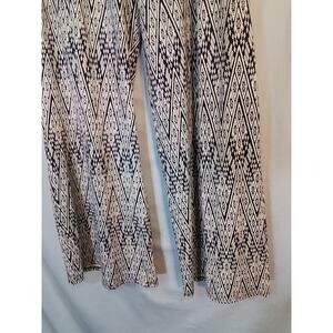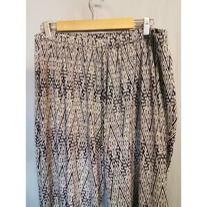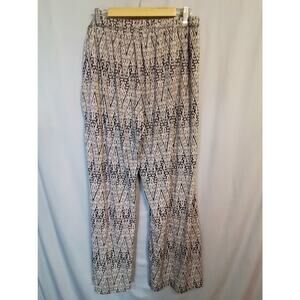 Love Ryan plus sized navy and white geometric print pants non pull tie in front and elastic waistline.