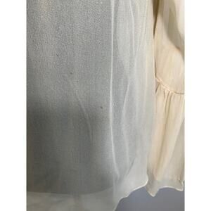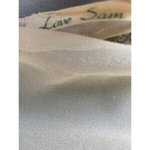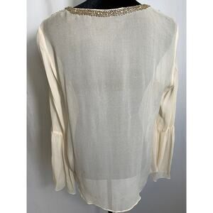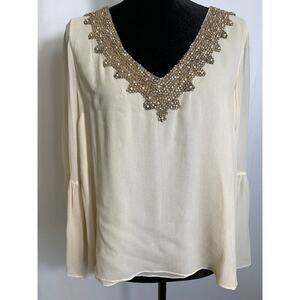 Love Sam Beige Beaded V-neck Bell Sleeve Blouse. Delicate off-white fabric with intricate beading around deep v-neckline in a vintage style. Feminine flared sleeves. Stylish top to pair with jeans or can be dressier with leather pants. Fabric has a couple tiny pulls from the beading and there are tiny spots on back (see pic) but overall in very good condition.