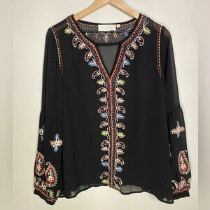 Love Sam Embroidered Peasant Top Black Sheer M boho feminine 70s Anthropology