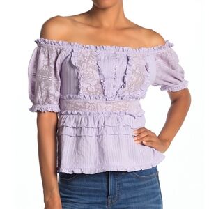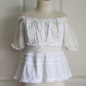 Love Sam Top Off Shoulder Short Sleeve Lace Ruffle Trim Semi-Sheer White M NWT