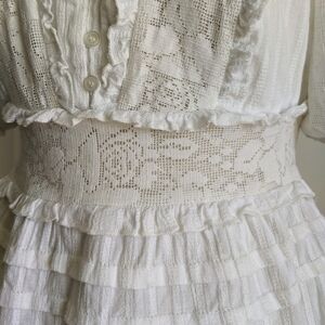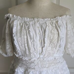 Off-the-shoulder neckline. Short sleeves. Lace panel details. Ruffle trim. Elasticized neckline and sleeve cuffs. Hidden side seam zipper (see pic #11). Six button placket at center front. Slightly cropped silhouette. Semi-sheer. Slips on over head.