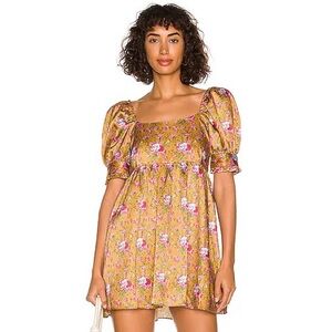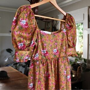 Empire waist mini floral dress with a flattering square neckline and puff sleeves. The sleeves close with two sateen covered buttons and ruffle hem. In the style of Bridgerton.