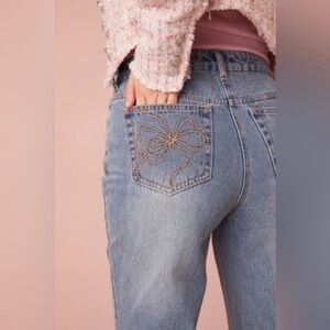 These pants have a distressed hem and an embroidered bow at the back. The pair is finished with custom LoveShackFancy buttons.