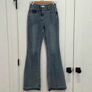 LoveShackFancy jeans, featuring a high-rise waist and a dramatic flare from the knee down. The classic blue color and clean finish make them a versatile addition to any wardrobe, perfect for adding a touch of vintage charm to your style.