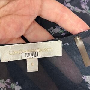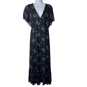 Love Shack Fancy Kover Bow Print Tiered Navy Blue Viscose Maxi Sheer Lined Dress Size 8 Flutter Sleeve Romantic Feminine Cottage Boho Soft Coquette Elegant V-Neck Ruffle Hem Side Zipper Empire Waist MSRP $595