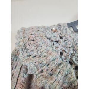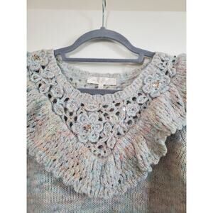Style: Ruffled embellished Luellan wool blend sweater. Round neckline. Crochet around neckline and down top of sleeves. Ruffle accent below crochet accent. Sequin and floral accents around neckline. Beautiful pastel multi-color pattern. Long, balloon like sleeves with tight ribbing at wrists. Tight-knit and stretch. Pullover closure. 51% Recycled Polyester, 27% Nylon, 13% Acrylic, 9% Wool. Made in China. Dry Clean Only.