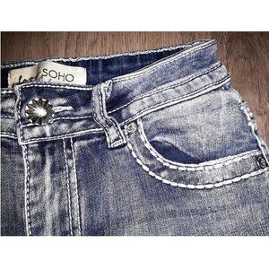 Women's/Juniors Love Soho wide leg pants/flared jeans/denim flares/boot cut jeans/bell bottoms. Size 1. Studded and embroidered front and back pockets accented with rhinestone bling. Light wash denim. Very good condition. Intentionally distressed denim.
