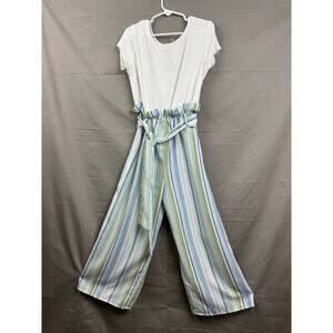 Romper: Features a white, blue, and green vertical striped pattern. It has a high, elasticized waist with a matching fabric tie belt. The top is a solid white, ribbed short-sleeve shirt.