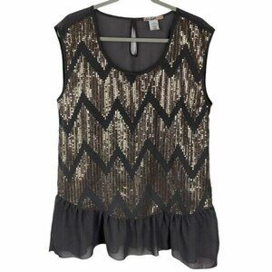 Love Squared Women's Large Gray Taupe Sequin Chevron Ruffle Hem Sleeveless Blouse. Sheer back with keyhole neckline. Smoke free home. Great Condition.