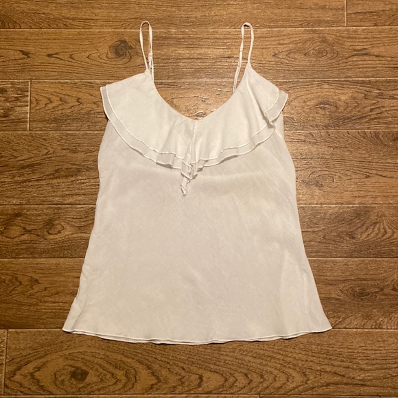 Super cute cami with ruffle detail, lightweight and perfect for summer! Some minor pilling as pictured, inside tag is a bit frayed but does not effect wear.