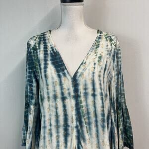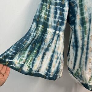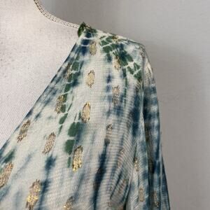 Love Stitch Blouse Top size Medium Teal Gold Sparkle Front Ties Garden Boho