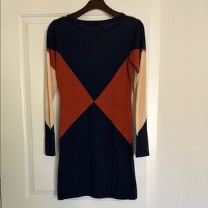 Stylish colorblock knit dress featuring a bold design in black, cream, and orange. Perfect for any occasion.