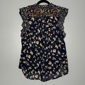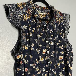 Love Stitch Large Blouse Sheer Floral Navy Button Ruffle Cap Sleeve Round Hem
