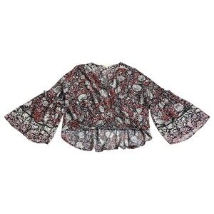 Love Stitch Top Women M Black Floral Metallic Wrap Cross Over Bell Sleeve Boho