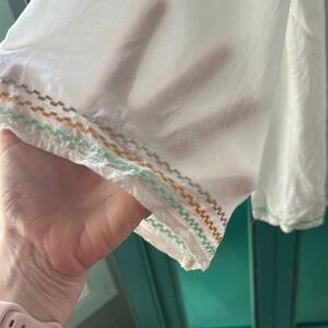 Chic white blouse featuring vibrant geometric embroidery. Ideal for stylish outings. Ai model.