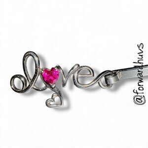 Elegant open-ended cuff bracelet crafted in solid .925 sterling silver, featuring the word “love” in flowing cursive script. The design is centered around a heart-shaped synthetic ruby, set in place of the letter “o” for a romantic and eye-catching accent. The bracelet is marked “925 LA”, confirming sterling purity and origin.