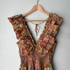 Stunning Love The Label open-back tiered "Topanga" ruffle Maxi Dress in the sought-after Carmela Coral Print. Features a deep ruffle V-neckline, open back with tie detail, smocked waist for a flattering silhouette, and a tiered ruffle hem. Brown with multicolor floral like pink, blue, orange etc. Size medium.