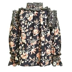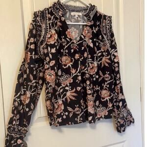 This V-neck Button Up long sleeve blouse features ruffle details on the neck line, shoulder, and arm cuffs. In the Devon Print. 100% cotton poplin. Buttons are