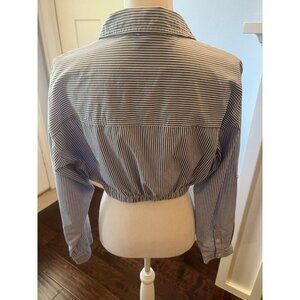 Great 100% cotton blue and white striped cropped top from Love Tree. Roll tab sleeves and button front. Front chest pocket, excellent condition. 15" length, 20.5" armpit to armpit. Would be great with a long skirt, white pants, jeans. So cute!