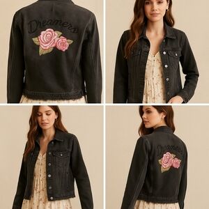 Channel effortless cool with this edgy yet feminine black denim jacket by Love Tree. Features raw hem, light distressing throughout, and a stunning embroidered rose + “Dreamers” motif on the back. A perfect layering piece for festival season, brunch, or everyday statement style.