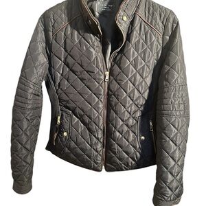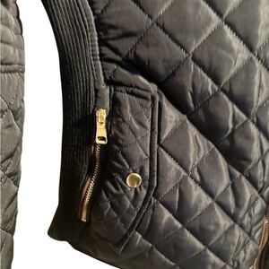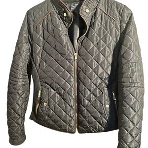 Stay stylish and warm with this black quilted jacket. Perfect for any occasion. Moto fitted style. Brown piping, members only collar, concealed knit side,