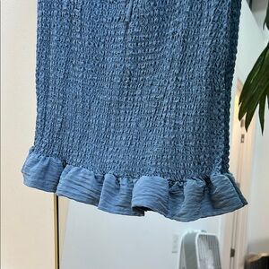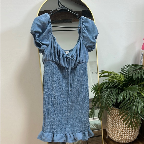Chic blue dress with ruffle hem. Features puff sleeves and tie front. Perfect for casual outings.