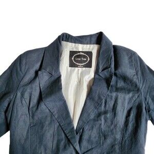 Brand: Love Tree. Occasion: Business, Casual, Travel, Workwear, Any. Size Type: Regular. Size (Women's): M. Material: SELF 100% Linen. LINING: 100% Polyester. Neckline: Collared. Style: Blazer jacket. style# L8647J. Sleeve Length: 3/4 sleeve. Color: Bluish tint. Pattern: Solid. Features: Pinstripe lining. Shoulder pads (non-removable). 1 front button closure. Sewn pockets. 3/4 sleeve. Easy Care. Lightweight. 4 Button Cuffs.