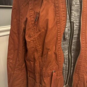 Burnt orange utility jacket with gray hoodie by Love Tree. Two full zippers. Size large, approximate measurements are pit to pit 19 inches, length 25 inches, and sleeve length 23.5 inches. Has been lovingly worn and is in excellent condition. Please review all pictures for condition details.