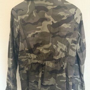 Chic olive camouflage jacket. Features a sleek design with a comfortable fit.