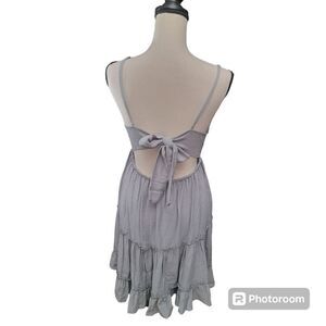 Women's open tie back mini dress with low plunging neckline and crocheted bodice and ruffled layers. In excellent pre-owned condition. Size M. Fits perfectly on size 6 mannequin.
