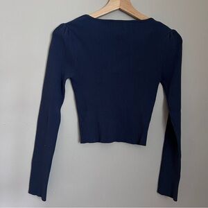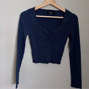 Cute and stylish casual deep blue ribbed long sleeve lightweight knit top. Features a unique neckline. Ideal for versatile styling. Like new, no flaws.