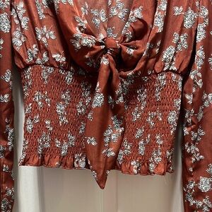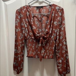 Love Tree Floral Rust Womens Small Blouse with Tie Front