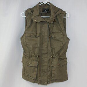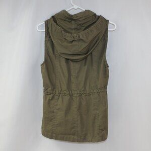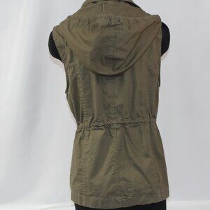 This is a great Love Tree khaki military style vest in size large. This vest has four snap pockets on the front, with a collar and a drawstring hood. This is a snap closure vest with a waist draw string closure for a stylish fit. 100% cotton that is machine wash cold. This vest is in great pre-owned condition.