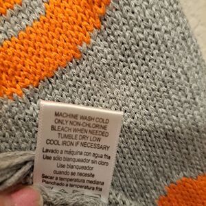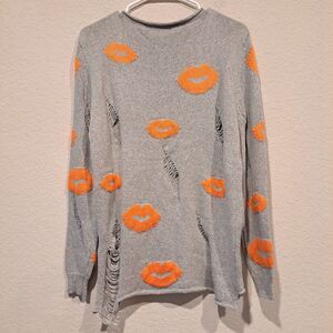 Adorable gray scoop/round neck sweater with orange lips all over it, accented with some intentional rips/tears for that comfy, distressed vibe!
