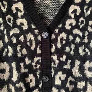 Leopard print button up cardigan by Love Tree. This cardigan has a black and cream or beige leopard print all over. The neckline, front, sleeve cuffs, and bottom have a black ribbed band. The front buttons up resulting in a v-neckline. It is pre-owned. There are a few, barely noticeable snags or separations in the knit of the sweater and there are very fine fibers or fuzziness. Otherwise, it's in great condition.