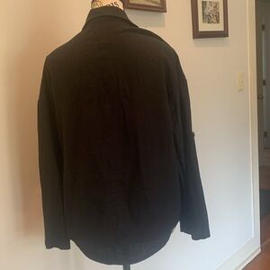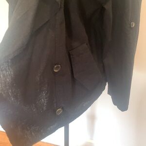 Pre-owned in excellent condition. Loose fit. Open front with non-functional buttons. Slash pockets with flap accent. Roll tab sleeves.