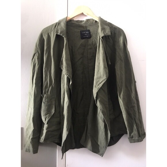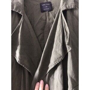 Love Tree Olive Linen Blend Shacket Convertible Sleeves Size Large. Picture does not do justice Ivy-olive green open front shacket. Large lapel collar. Slanted pockets. Convertible sleeves between full long sleeve and rolled up half/short sleeve. Decorative front buttons - dont really close. At cropped length with a little rounded front silhouette.