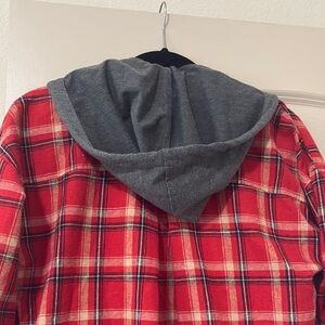 Stylish red plaid shirt with a hood. Features a classic design with a front pocket.