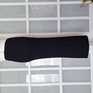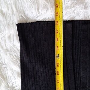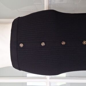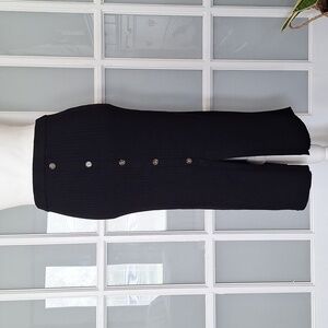 Figure flattering ribbed knit midi skirt with faux buttons down the front and a front slit. Perfect staple to have in your closet.