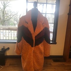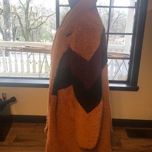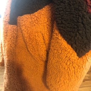 A darling, cozy waist length jacket. Size Medium. It's Rust / gold and burgundy colored. Only worn once. In like new condition. Has pockets and one snap in front.