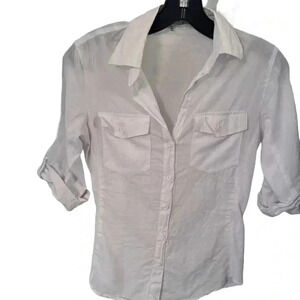 Excellent condition. Pure white button up shirt with ribbed front pockets and roll tab sleeves. Rib accent also on both sides of the blouse. Size small see photos for measurements.