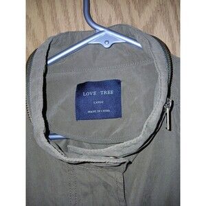 This Love Tree Utility Jacket is designed for women in size Large and features a stylish army green color with a drawstring waist for a flattering fit. Made of polyester and nylon fabric, this mid-length jacket has a collared neckline, long sleeves, and a full zipper closure with additional snap and drawstring accents. It is suitable for all seasons and occasions, making it a versatile addition to your wardrobe. With its utility style and practical features like pockets, this jacket is perfect for casual, workwear, or travel outfits.