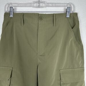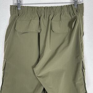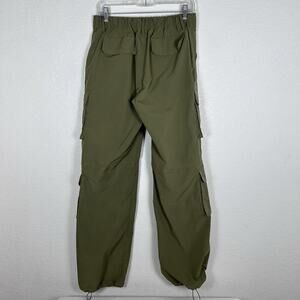 Gently used utility cargo pants with elastic back, zip & button front pants with cargo pockets and toggle hem. Fabric is similar to a windbreaker utility fabric.