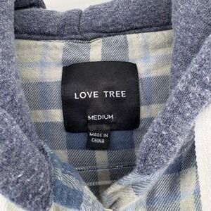 Love Tree flannel hoodie, plaid shacket, cropped flannel shirt, button-up hoodie shirt, women's medium, flannel hybrid jacket, fall layering piece, cozy plaid top, hooded flannel, grunge streetwear, gray hood plaid flannel
