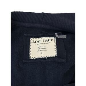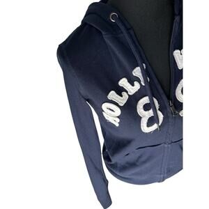 Navy blue Love Tree women’s hoodie with full zip front. Features “Hollywood 89” embroidered lettering across the chest in stitched detail. Size small. Measures approx. 20” pit to pit and 22.5” long.