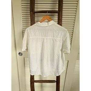 Crisp and versatile top for effortless styling. This white, short-sleeve button-down shirt features a V-neckline and two functional chest pockets, blending practicality with a relaxed aesthetic. The neutral color makes it easy to pair with various bottoms, while the button-down design allows for versatile styling options. Perfect for a casual brunch, a day at the office, or a relaxed weekend outing. Pre-loved in good condition.